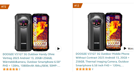 Am 25. Oktober brach das DOOGEE V31GT alle Verkaufsrekorde und wurde zum meistverkauften Rugged Phone von DOOGEE auf dem Elektronikmarkt. Seine unglaubliche Leistung katapultierte es auf den beeindruckenden 72. Platz in der Kategorie Mobiltelefone auf Amazon und sicherte sich den 12. Platz im Ranking der neuesten Produkte auf Amazon. Dies spiegelt die immense Beliebtheit und Nachfrage nach diesem robusten Telefon wider. Zusätzlich erhielt das DOOGEE V31GT glühende Fünf-Sterne-Bewertungen von zufriedenen Käufern, die seine außergewöhnliche Qualität und Leistung bestätigen. Die nachfolgenden bemerkenswerten Errungenschaften belegen die herausragende professionelle Innovation und Langlebigkeit des DOOGEE V31GT.
