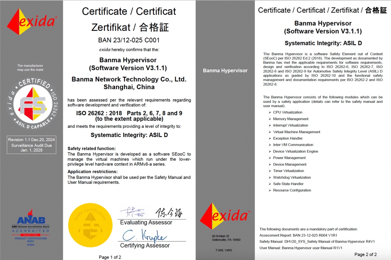 Durante il CES, l'hypervisor di Banma ha ottenuto il certificato di sicurezza funzionale di livello massimo ISO 26262 ASIL-D, rilasciato da Exida, un rinomato ente di certificazione internazionale. Questo risultato rappresenta una pietra miliare, poiché è il primo prodotto di virtualizzazione sviluppato in Cina a ricevere questa prestigiosa certificazione, offrendo un solido supporto per l'integrazione tra cabina e conducente.